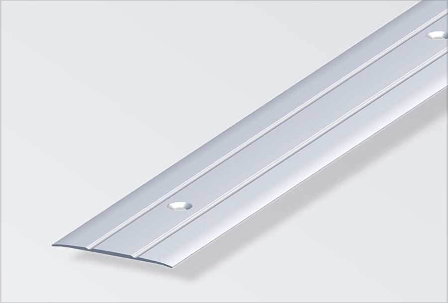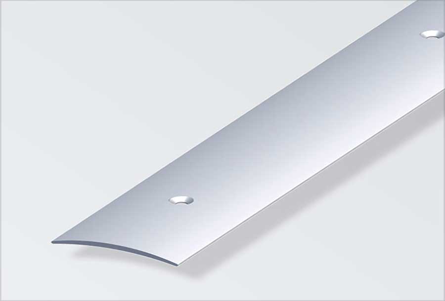 Overgangsprofil i sølveloxeret aluminium med buet overgang og centrerede huller. Velegnet til at skabe en pæn, jævn og elegant overgang mellem to gulvtyper. Mål: (a) 30 mm og (b) 5 mm.