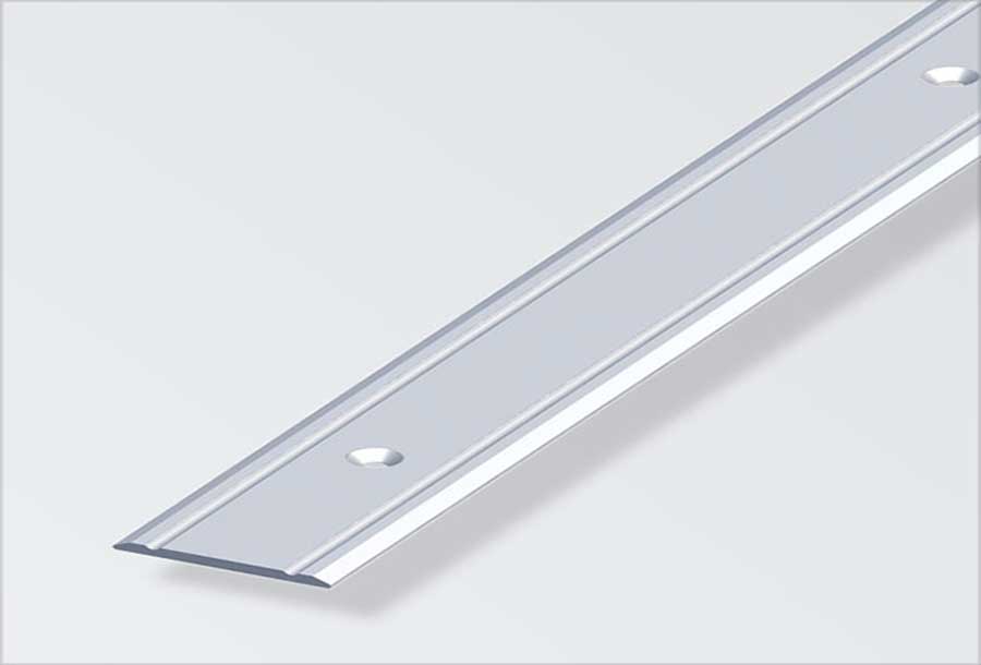 Trappeprofil i sølveloxeret aluminium med centrerede huller. Ideel til at beskytte trappekanten og øge skridsikkerheden. Mål: (a) 19 mm og (b) 20 mm.