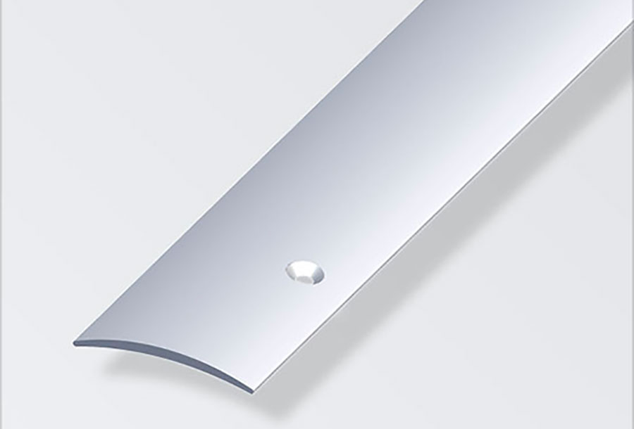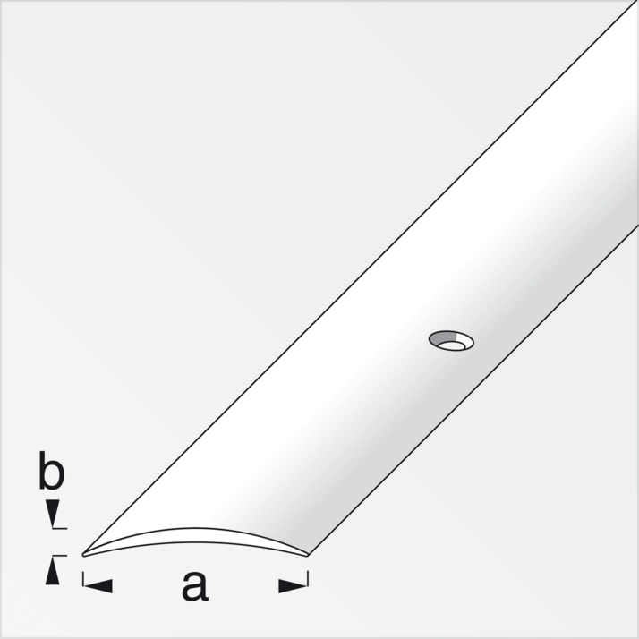 Overgangsprofil i sølveloxeret aluminium med centrerede huller. Velegnet til at skabe en pæn, jævn og elegant overgang mellem to gulvtyper. Mål: (a) 40 mm og (b) 5 mm.