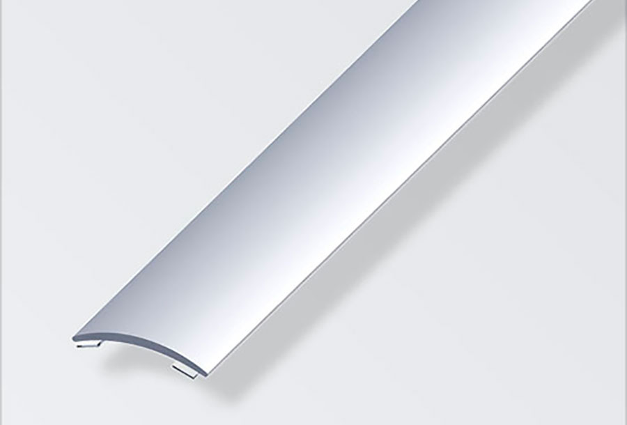 Overgangsprofil i sølveloxeret aluminium med buet overgang og sidehuller. Velegnet til at skabe en pæn, jævn og elegant overgang mellem to gulvtyper. Mål: (a) 40 mm og (b) 5 mm.