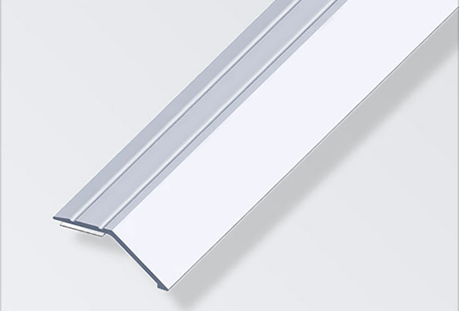 Niveaulisten er selvklæbende og i sølveloxeret aluminium. Anvendes til overgangen mellem to gulvtyper. Mål: (a) 34 mm og (b) 8 mm.