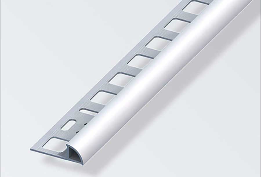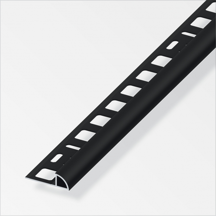 Kvartcirklet fliseafslutningsprofil i sort eloxeret aluminium med et børstet look. Anvendes til at lave en pæn afslutning af fliser på et badeværelse eller i et køkken. Højde "a" 10 mm og bredde "b" 19,5 mm