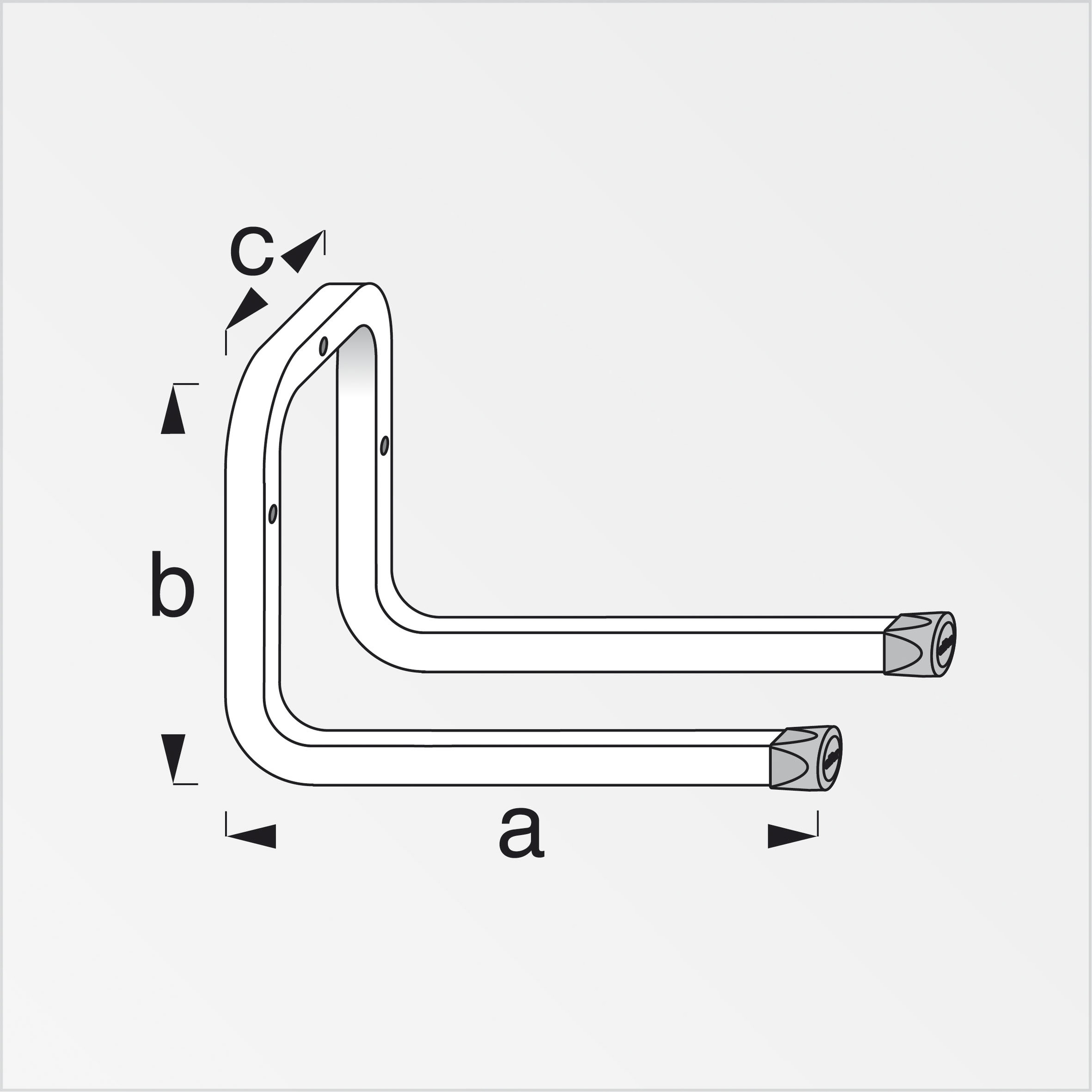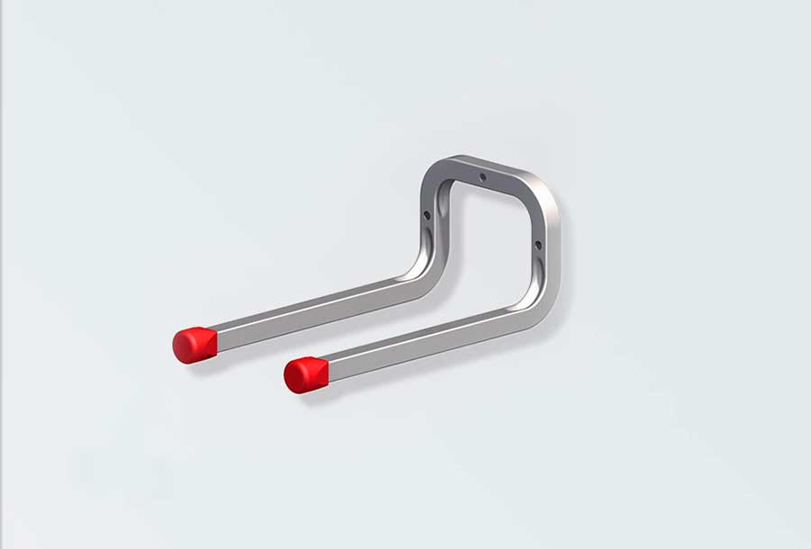 Vægkrog i galvaniseret stål med rød gummiende. Kan anvendes sammen med X- star skinne ID 2602934 og Alfer monteringsbeslag ID 2603831. Bæreevne max. 25 kg. Mål: (a) 350 mm og (b) 165 mm.