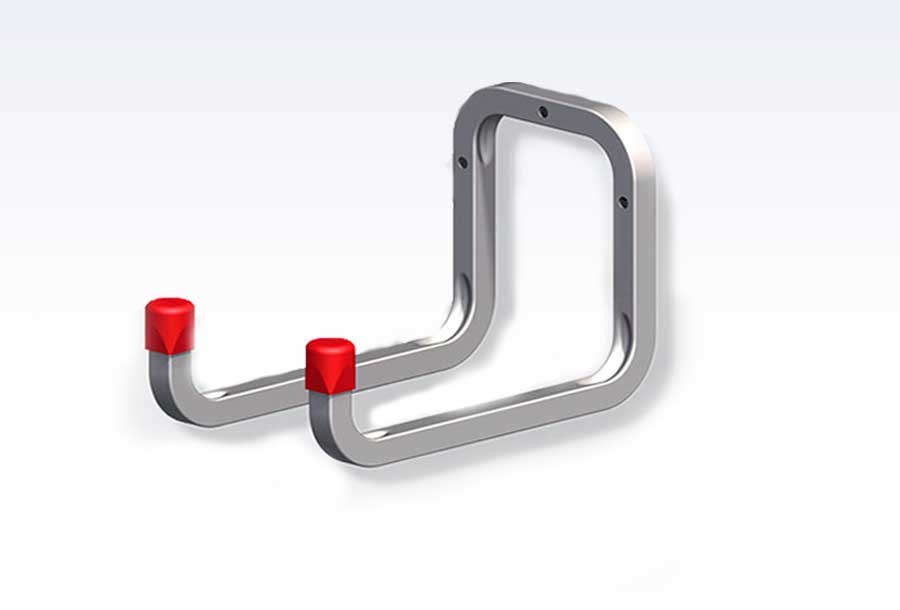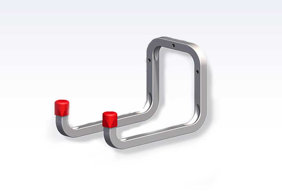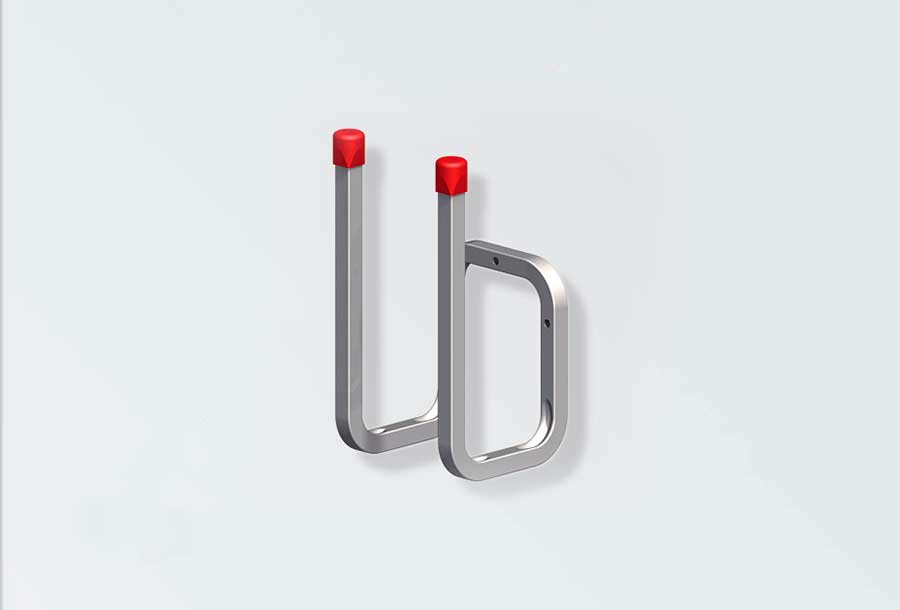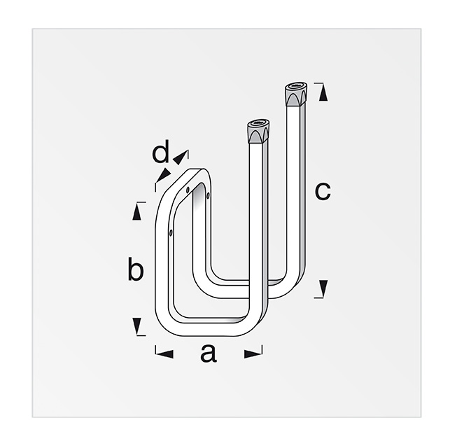 Redskabsholder i galvaniseret stål med rød gummiende. Velegnet til ophæng af haveredskaber med T-greb. Max belastning 12 kg. Mål: (a) 325 mm (b) 120 mm (c) 98 mm.