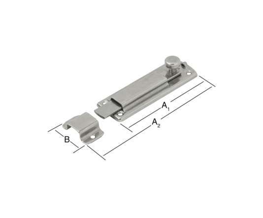 Skudrigle med knop i rustfri stål A2, der kan anvendes på døre og låger - både inde og ude. Inkl. skydebeslag. Længde 80 mm (A1). Længde (A2) 100 mm, Bredde 22 mm (B). Materialetykkelse 1 mm.