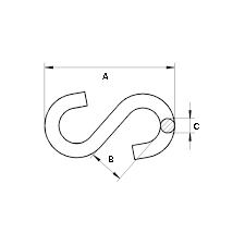 S-Hage/S-Krog. Ophængningskrog til samling og ophængning af forskellige materialer. Trådtykkelse 4,5 mm (C), længde 40 mm (A) og krog åbning mm 6 (B).