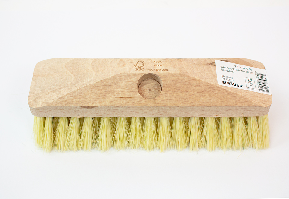 Syrekost/tjærekost med børster af tampico fibre. Ulakeret træoverdel til skaft Ø 25 mm. Passer til træskaft ID 631640 ( 1500 mm) eller ID 631645 ( 1800 mm ). Bemærk: Inden brug bør børsten skruppes mod et ru underlag, for at fjerne overskydende hår.