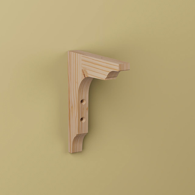 Hyldeknægt i hvidlakeret fyr (Farvekode NCS S0500-N halvblank hvid). Forboret og med 2 x 2 forsænkede borehuller til hylde og væg. Dybde 150 mm. Skruer medfølger ikke. Vejl. max. belastning 30 kg. afhængig af skruer, plugs og vægmateriale.