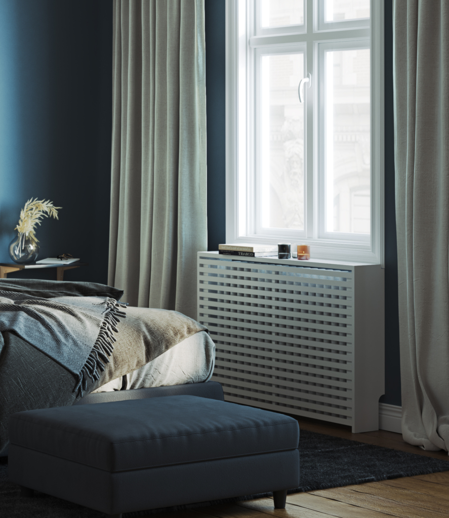 Lundbergs radiatorskjuler model Yoko i hvidlakeret MDF plade til vægmontage. Se vejledning til opsætning under fanen "manualer". Giver rummet et stilfuldt look, beskytter radiatoren mod støv og snavs og hjælper med at fordele varmen jævnt.