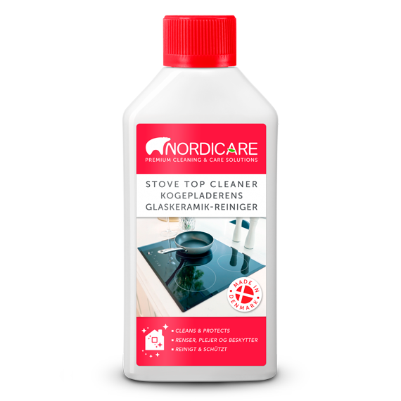 Fjerner effektivt brændte madrester mm. på glaskeramiske overflader. Udviklet og produceret i Danmark.