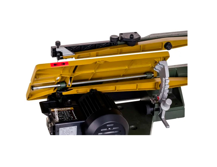 Stabil dekupørsav med ramme lavet af støbejern. Bordet kan vippes fra -5 grader til 50 grader og har to hastigheder. Kan skære i træ op til 60 mm, og i ikke-jernholdige metaller (afhængig af type) 10 - 15 mm.