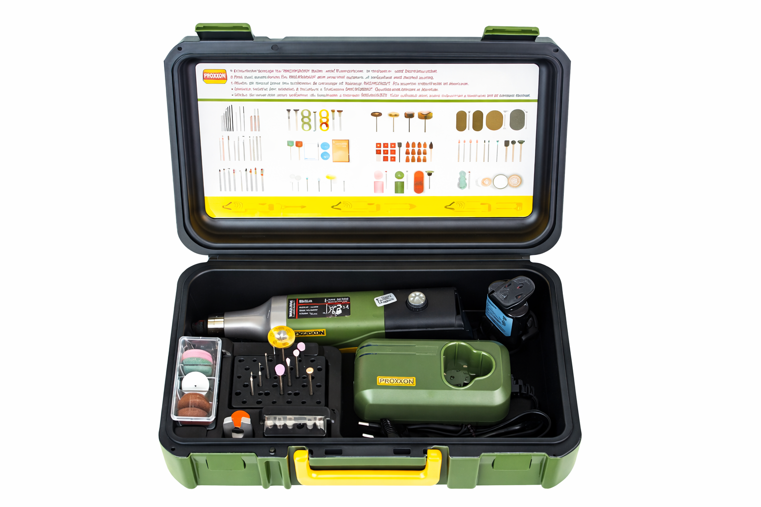 PROXXON MICROMOT-værktøj er designet til præcisionsopgaver og adskiller sig fra almindeligt elværktøj ved at være finere, mindre og lettere. Enheden er udstyret med en kraftig, støjsvag og holdbar permanent-magnetmotor, men dens kompakte størrelse gør den følsom over for overbelastning. Derfor er det afgørende at arbejde med let hånd og ikke presse for hårdt! – ydeevnen opnås gennem høj hastighed, ikke ved hårdt tryk. Hvis værktøjet bliver for varmt under brug, bør man holde pause og lade det køle af.