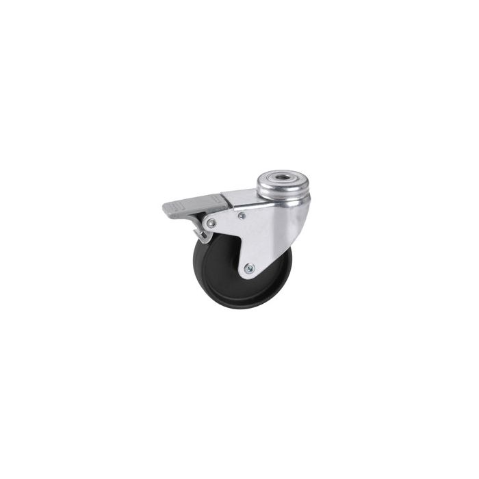 Transporthjul/møbelhjul med glideleje, bremse, dobbelte kuglelejer i huset, termoplastisk gummibane og fælg i plast. Hus og gevindbeskyttelse i forzinket stål. Bolthul Ø 10,2 mm. Højde total 121 mm. Bæreevne 55 kg.